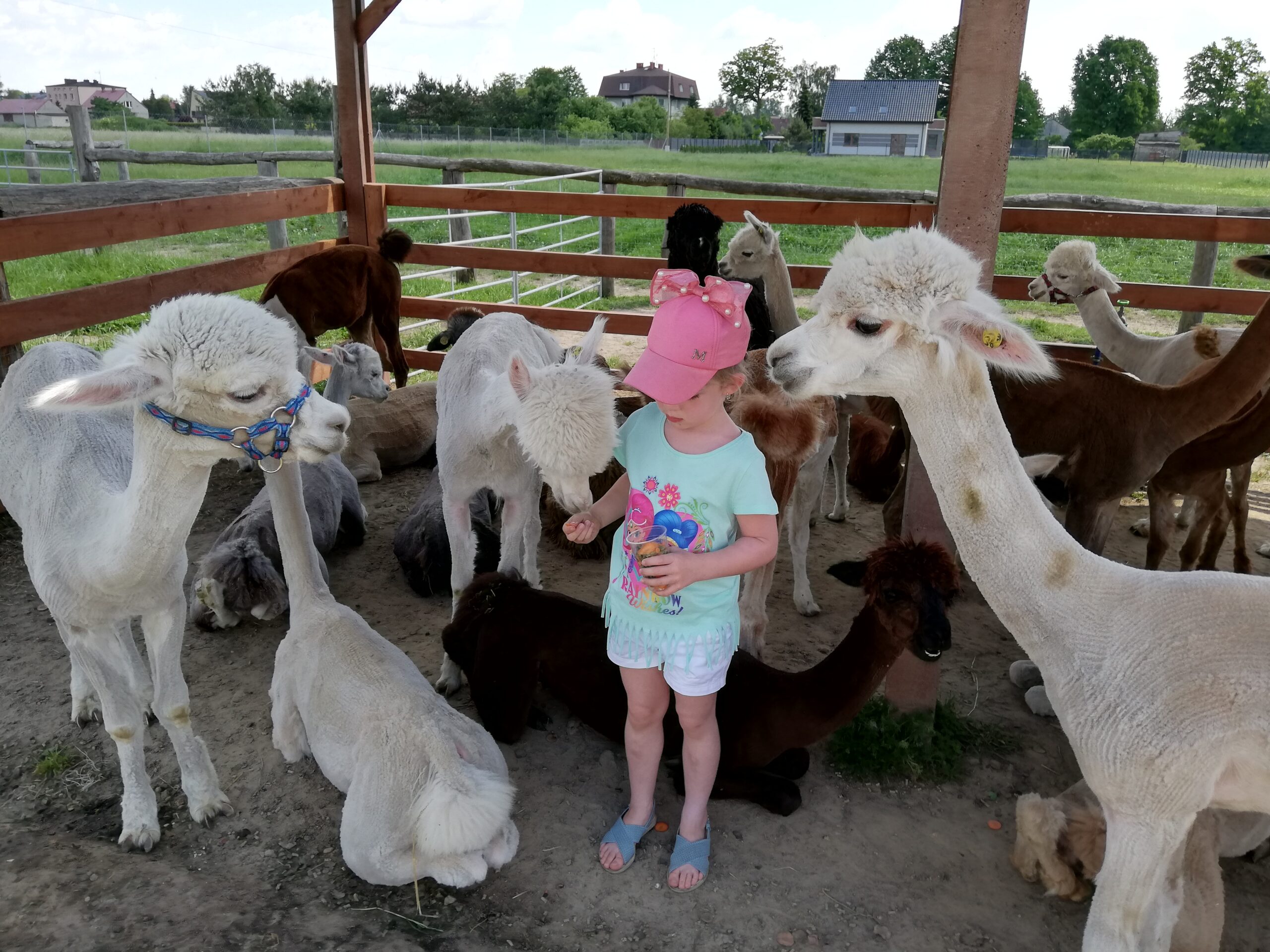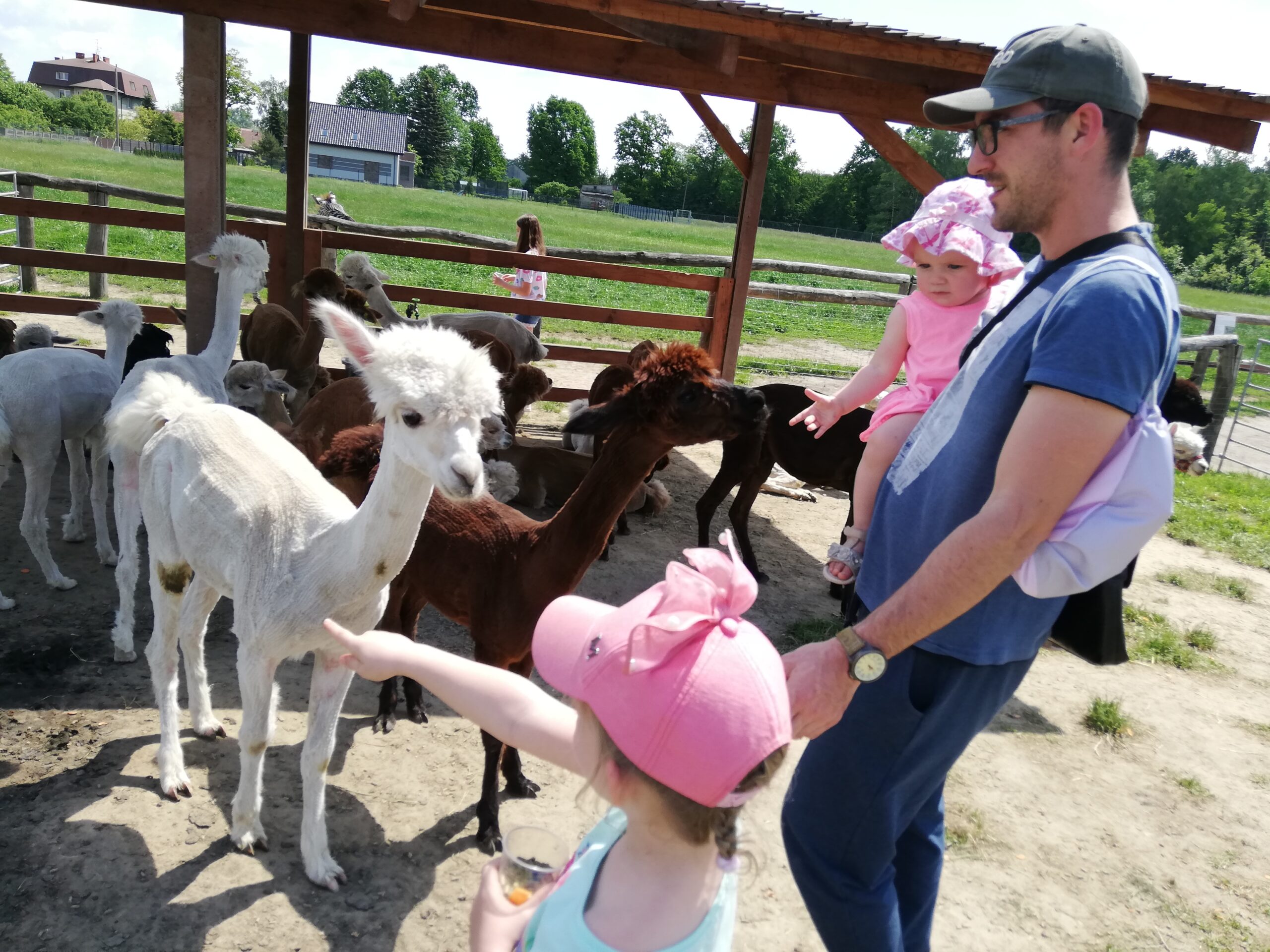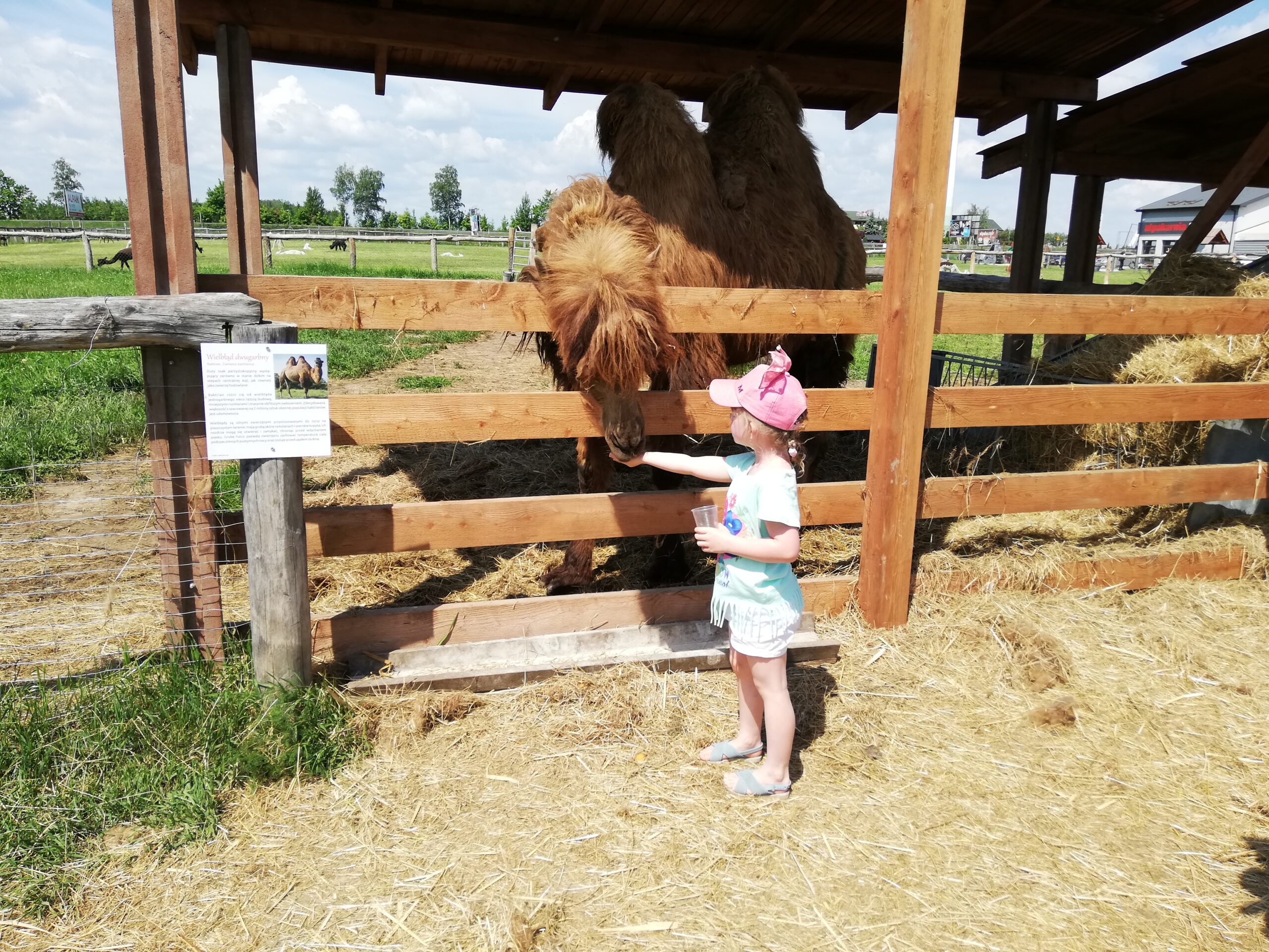 Za wejście na wybieg płaci się jednorazowo. Kubeczki z jedzeniem dla zwierząt są dodatkowo płatne. Rozala chyba kupiła ze 4, tak jej się spodobało spędzanie czasu z tymi wielkimi maskotkami. Zresztą nie dziwię jej się, bo i mnie się spodobało. Alpaki bardzo spokojnie zjadały podawane im z ręki przekąski. Podobnie jak wielbłąd, w ogóle ten to ma bardzo śmieszne wargi, trochę kolą, trochę łaskoczą, jak dwudniowy męski zarost.