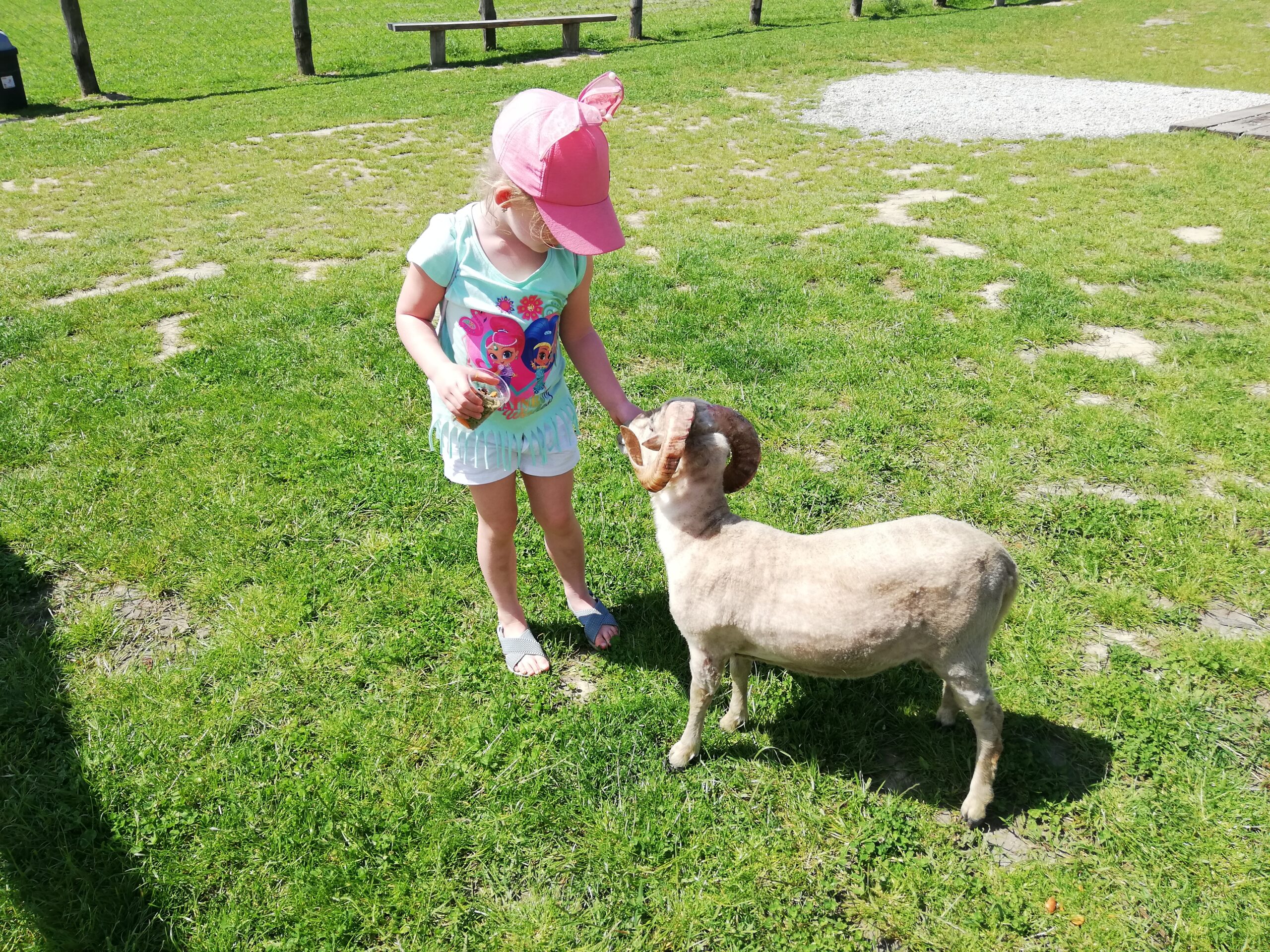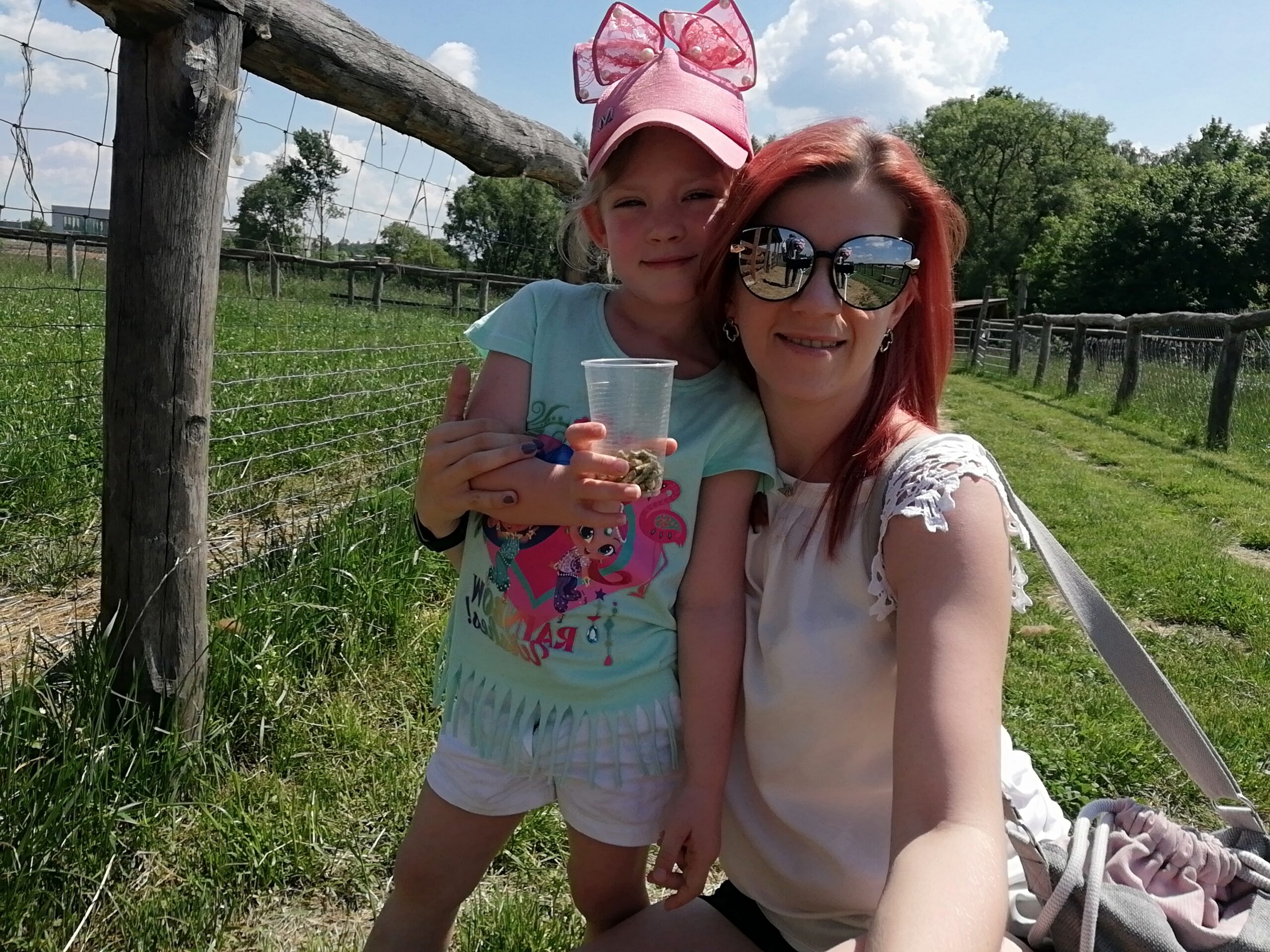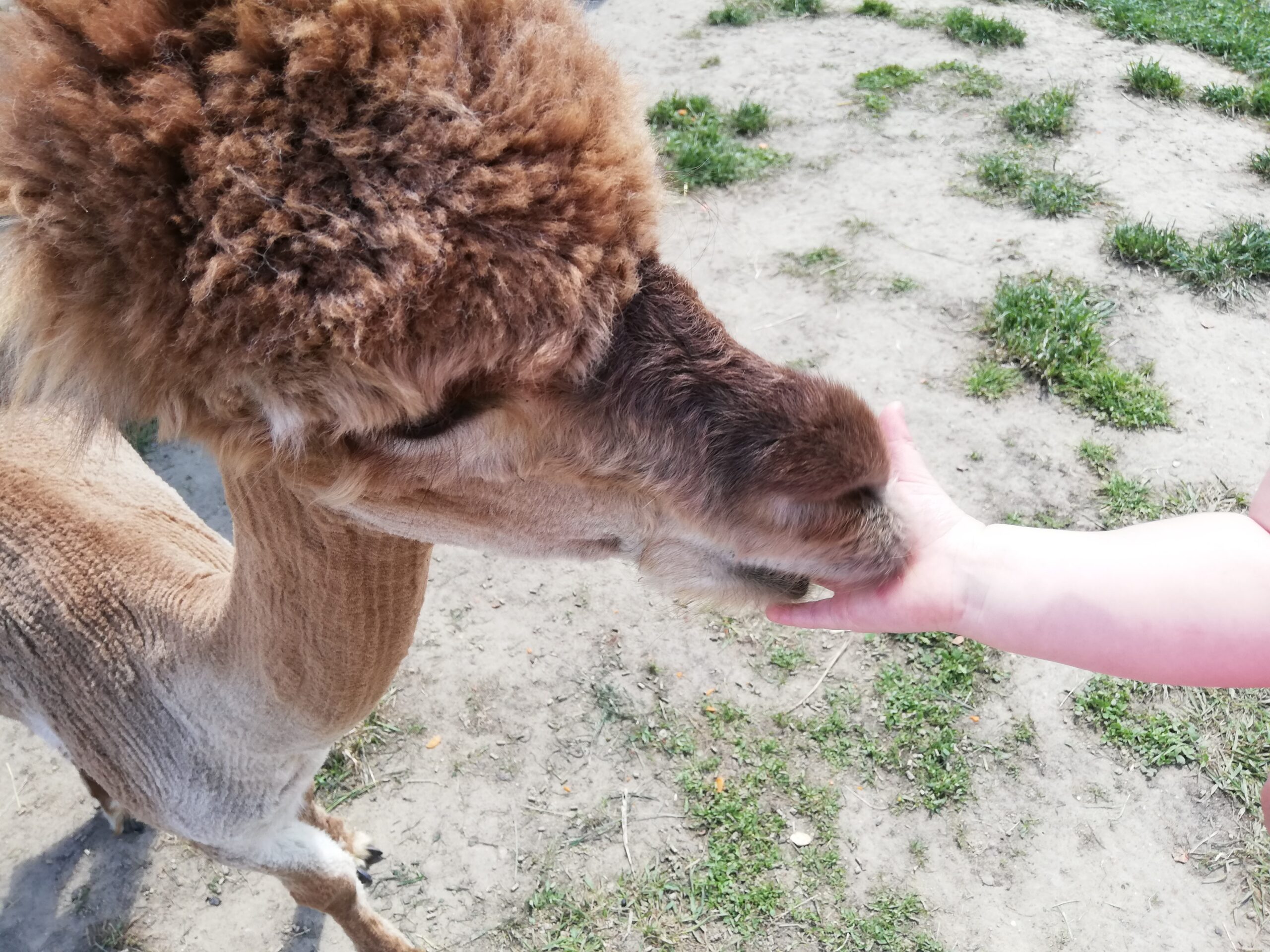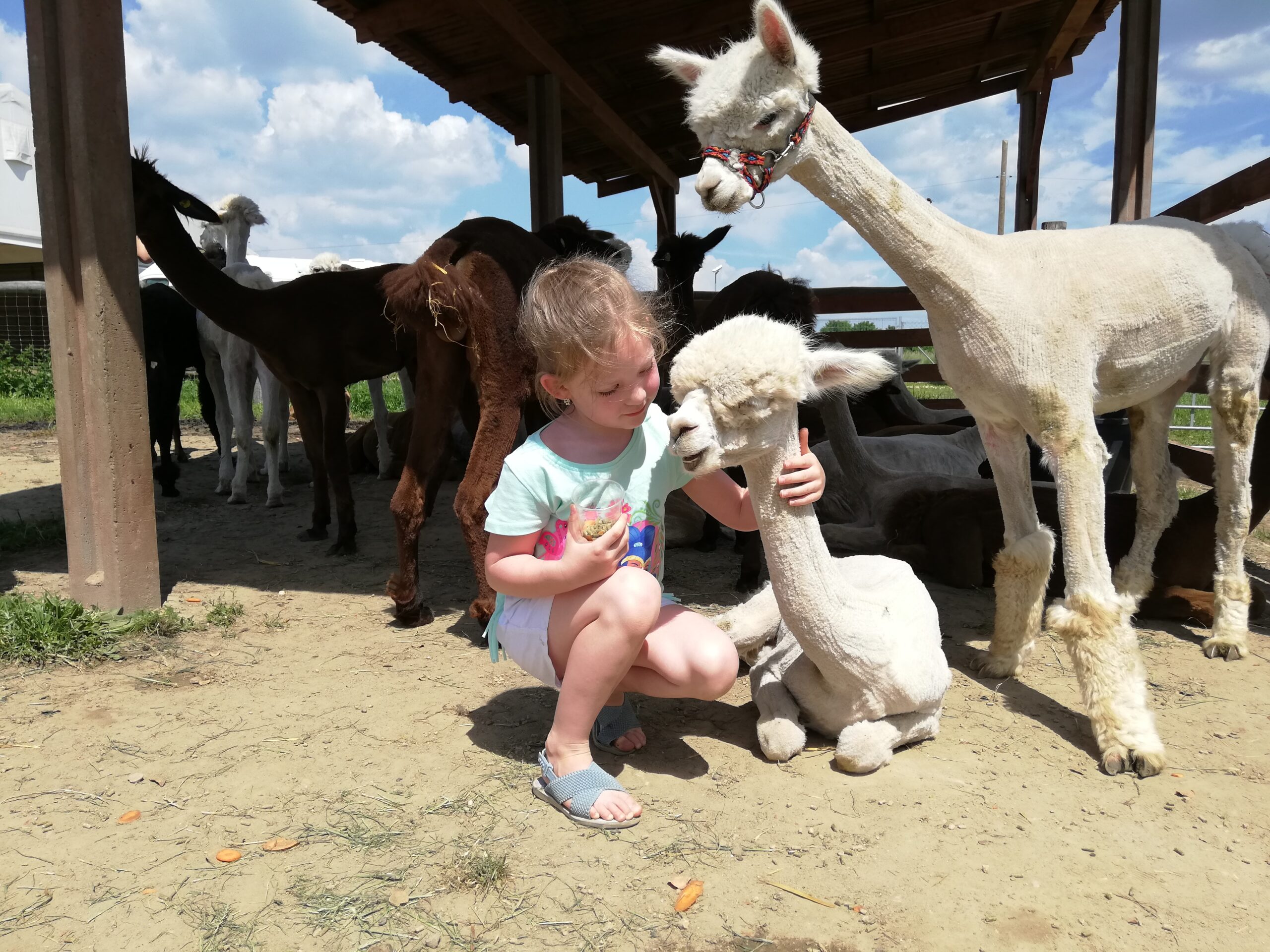 Za wejście na wybieg płaci się jednorazowo. Kubeczki z jedzeniem dla zwierząt są dodatkowo płatne. Rozala chyba kupiła ze 4, tak jej się spodobało spędzanie czasu z tymi wielkimi maskotkami. Zresztą nie dziwię jej się, bo i mnie się spodobało. Alpaki bardzo spokojnie zjadały podawane im z ręki przekąski. Podobnie jak wielbłąd, w ogóle ten to ma bardzo śmieszne wargi, trochę kolą, trochę łaskoczą, jak dwudniowy męski zarost.