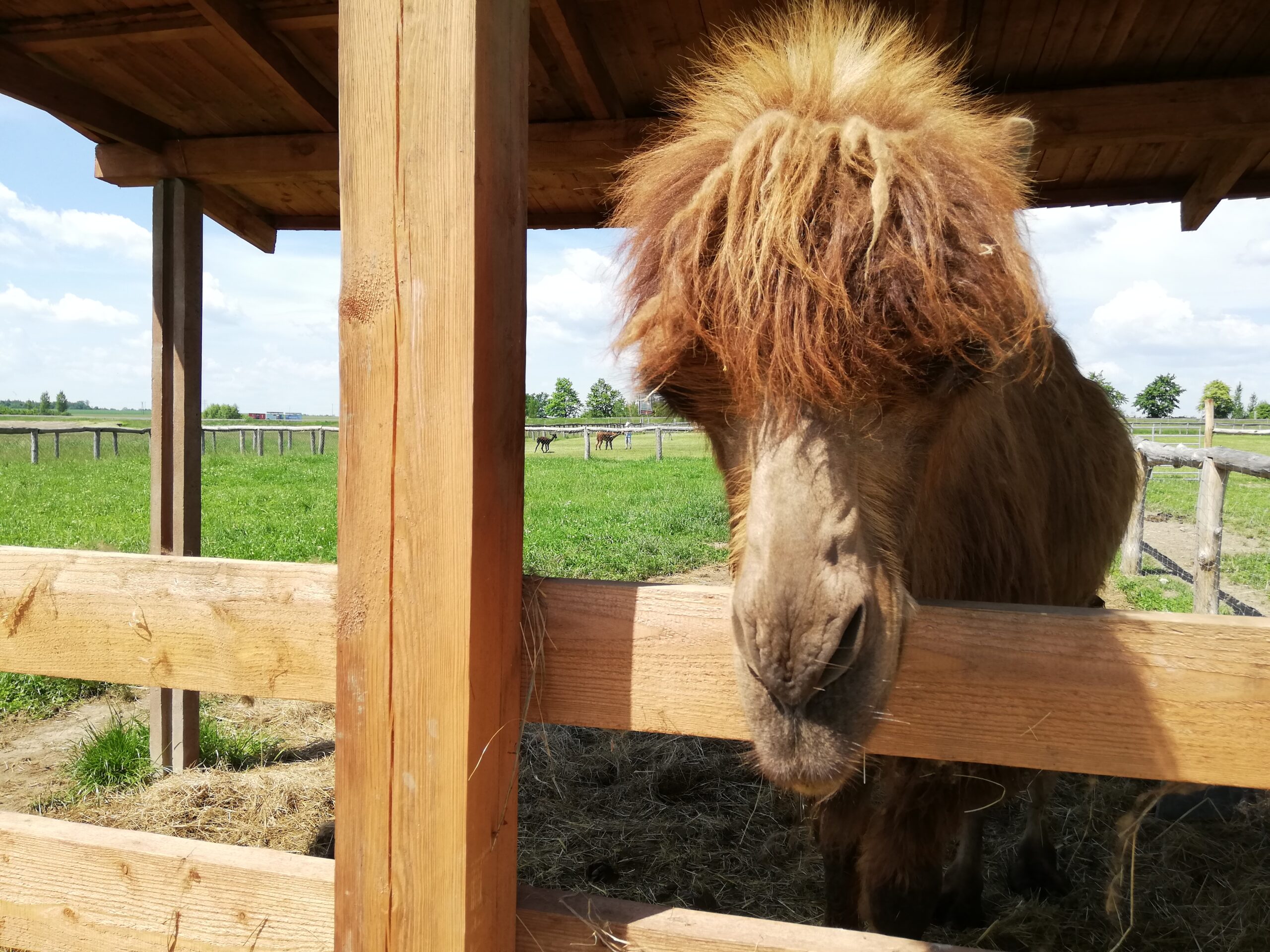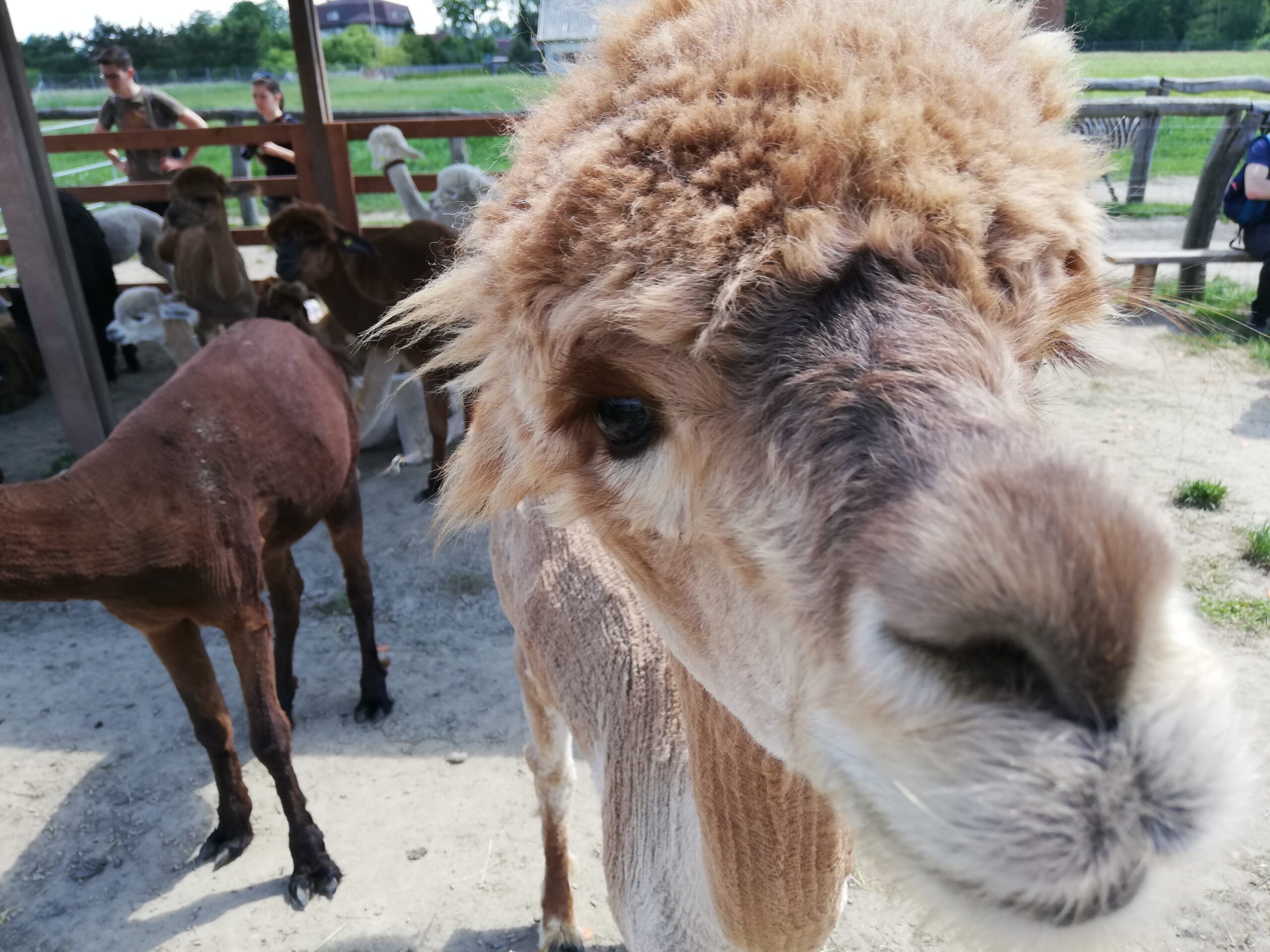 W kawiarni możecie zjeść pyszne lody, wypić naprawdę dobrą kawę, kupić rzeczy wykonane z wełny alpak i gadżety, np. kubki, koszulki czy okulary przeciwsłoneczne. Po wypiciu jednej kawy, a przed wypiciem kolejnej (lub zjedzeniem lodów) można wyjść na wybieg dla alpak. Poza milusimi alpakami, które są chętne na każdą przekąskę i chętnie się przytulą, spotkacie tu wielbłąda. Wielbłąd też je z ręki, najbardziej wchodzi mi marchewka. Są dwa kangury, czapla i kozica (nie wiem dokładnie jaka, ale siedzi z kangurami).