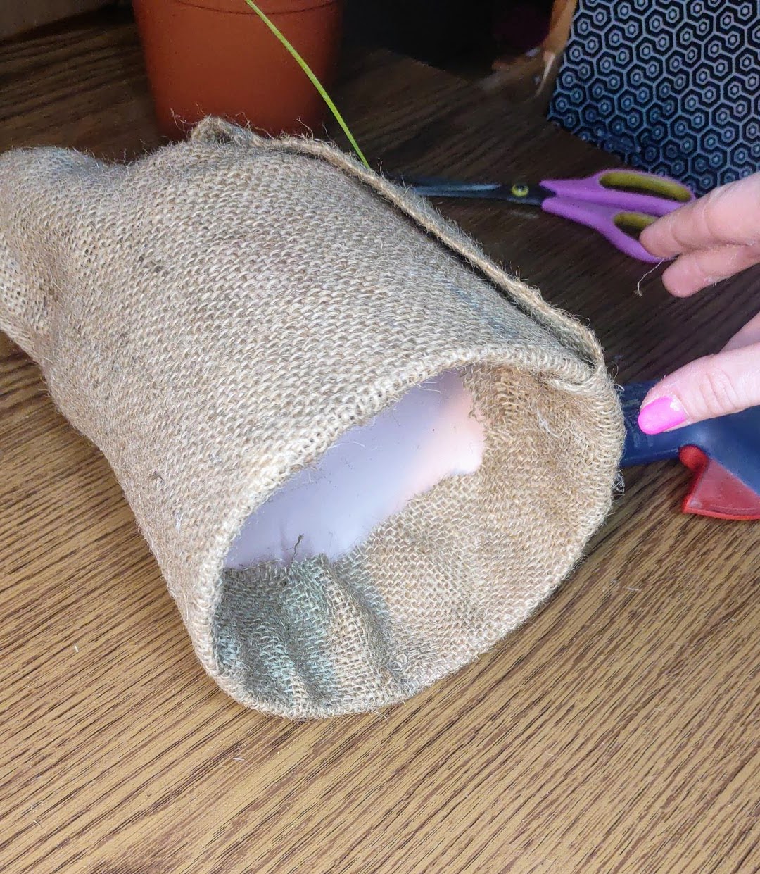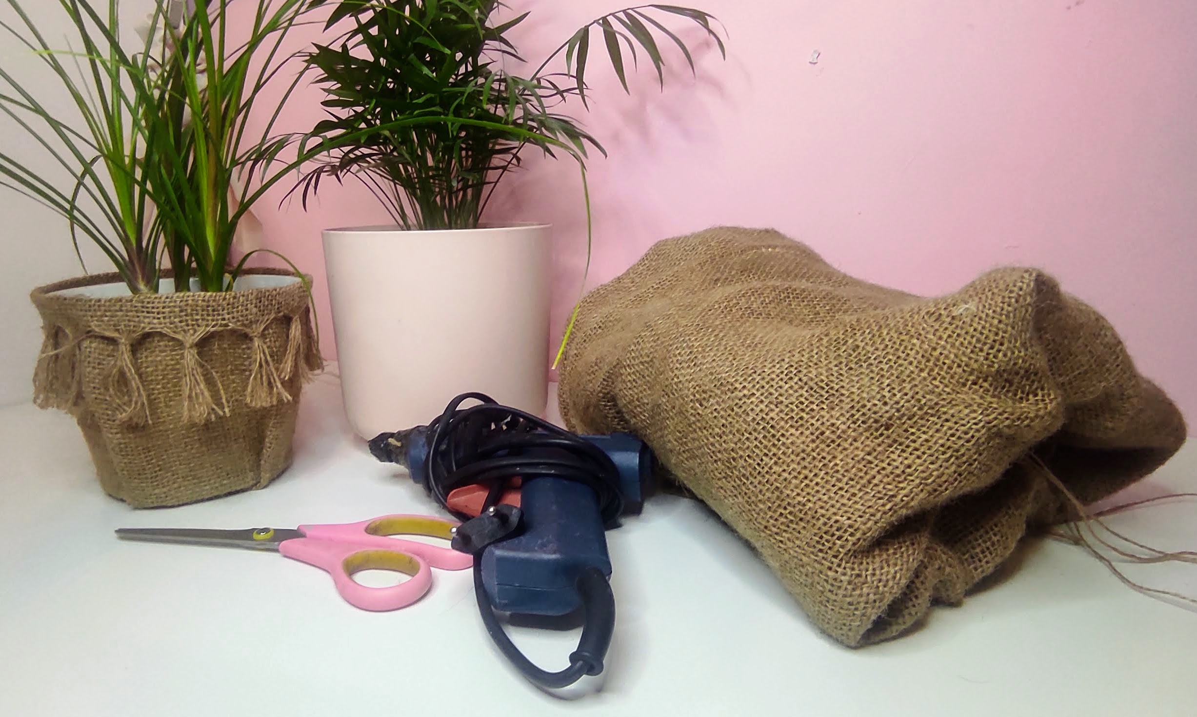 Mając to przygotowane możemy brać się do pracy. Odpalamy pistolet na klej, niech się dobrze zagrzeje. A w tym czasie docinamy jutę do naszej doniczki. Musicie sprawdzić jaki kawałek będzie potrzeby, aby owinąć nim doniczkę. Odmierzamy i docinamy odpowiednią wielkość.
