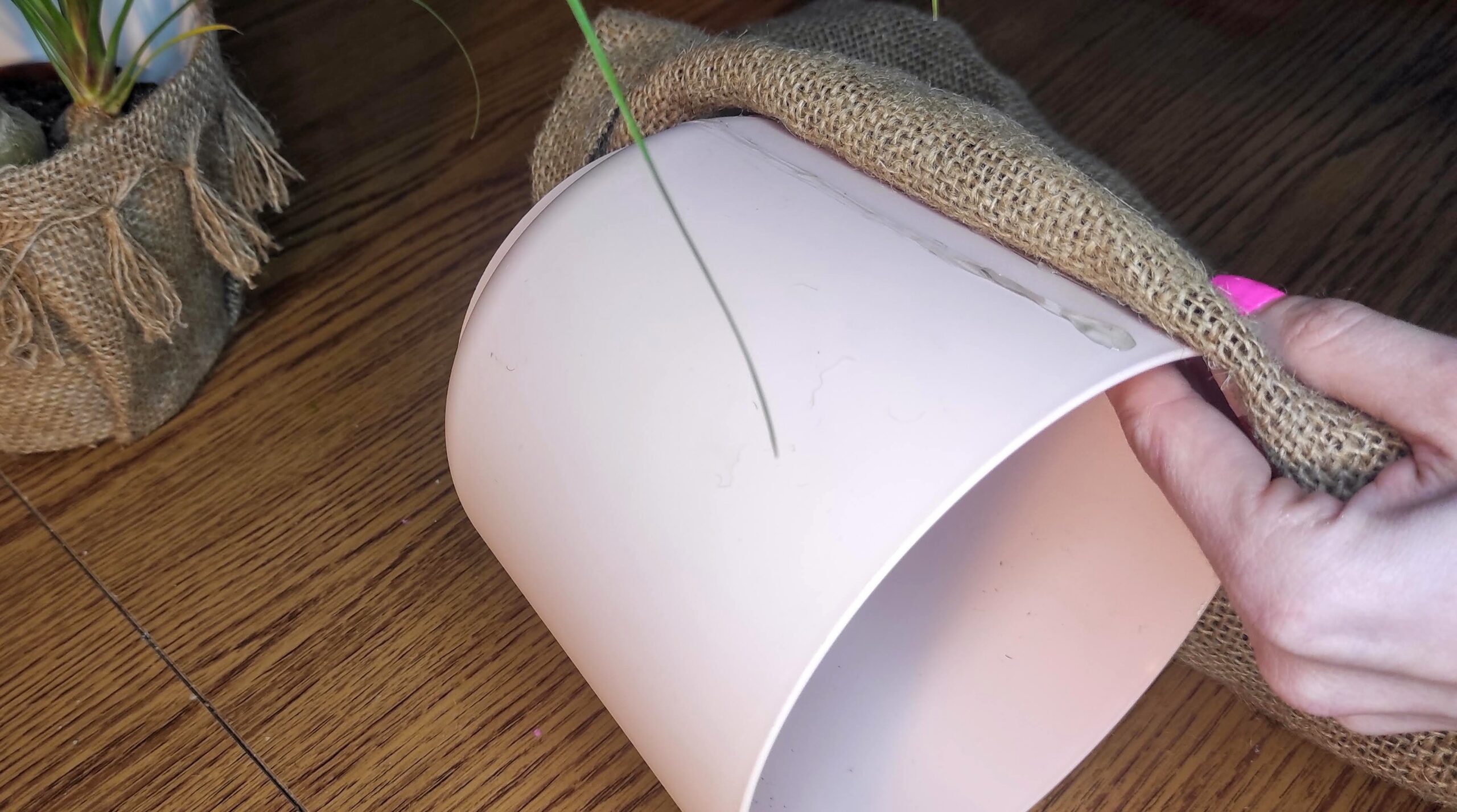 Kiedy owiniemy już całą doniczkę dookoła możemy wziąć się za brzegi. I teraz tak – ja robiłam dwie wersje doniczki. W pierwszej wywijałam nadmiar materiału na zewnątrz, rozplatałam kawałek i wiązałam tworząc chwosty. W drugim przypadku, i to widać na zdjęciach, zwijałam nadmiar juty do środka. To doskonale pokazuje jak fajnie można bawić się tworząc takie rzeczy.