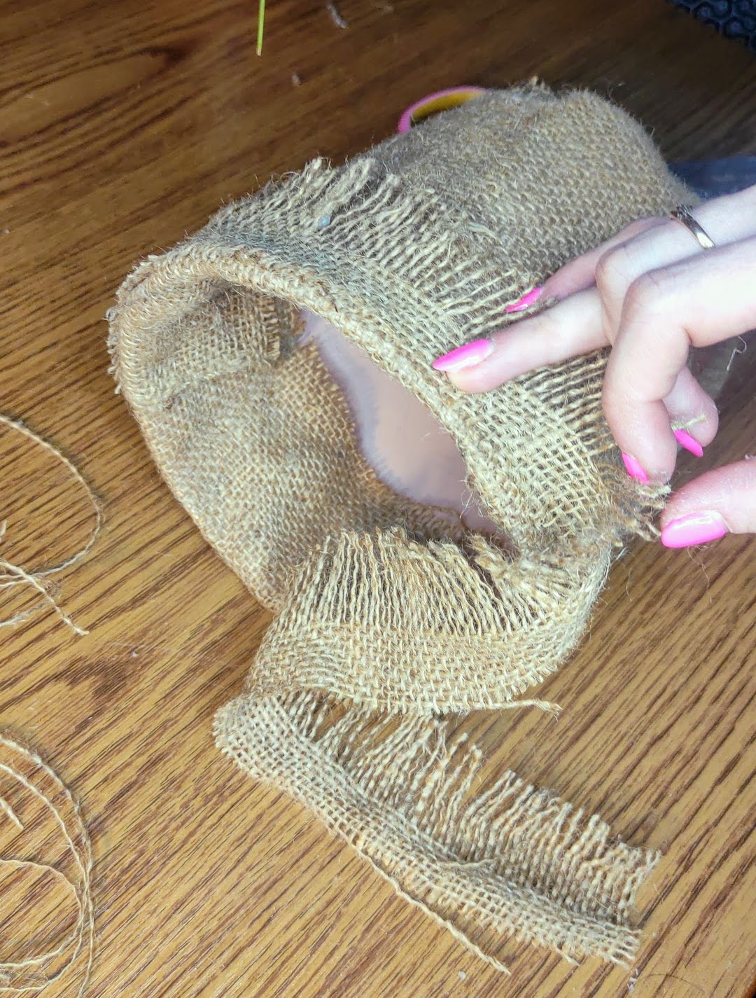 Na koniec postanowiłam ozdobić swoją osłonkę w nieco inny sposób. Odcięłam od mojego worka odpowiedniej długości pasek, jego szerokość to około 5 cm. Postanowiłam zrobić najprostsze frędzle. Wyciągałam pojedyncze jutowe sznureczki. Kiedy uznałam, że długość frędzelków będzie ok, przykleiłam je do doniczki.