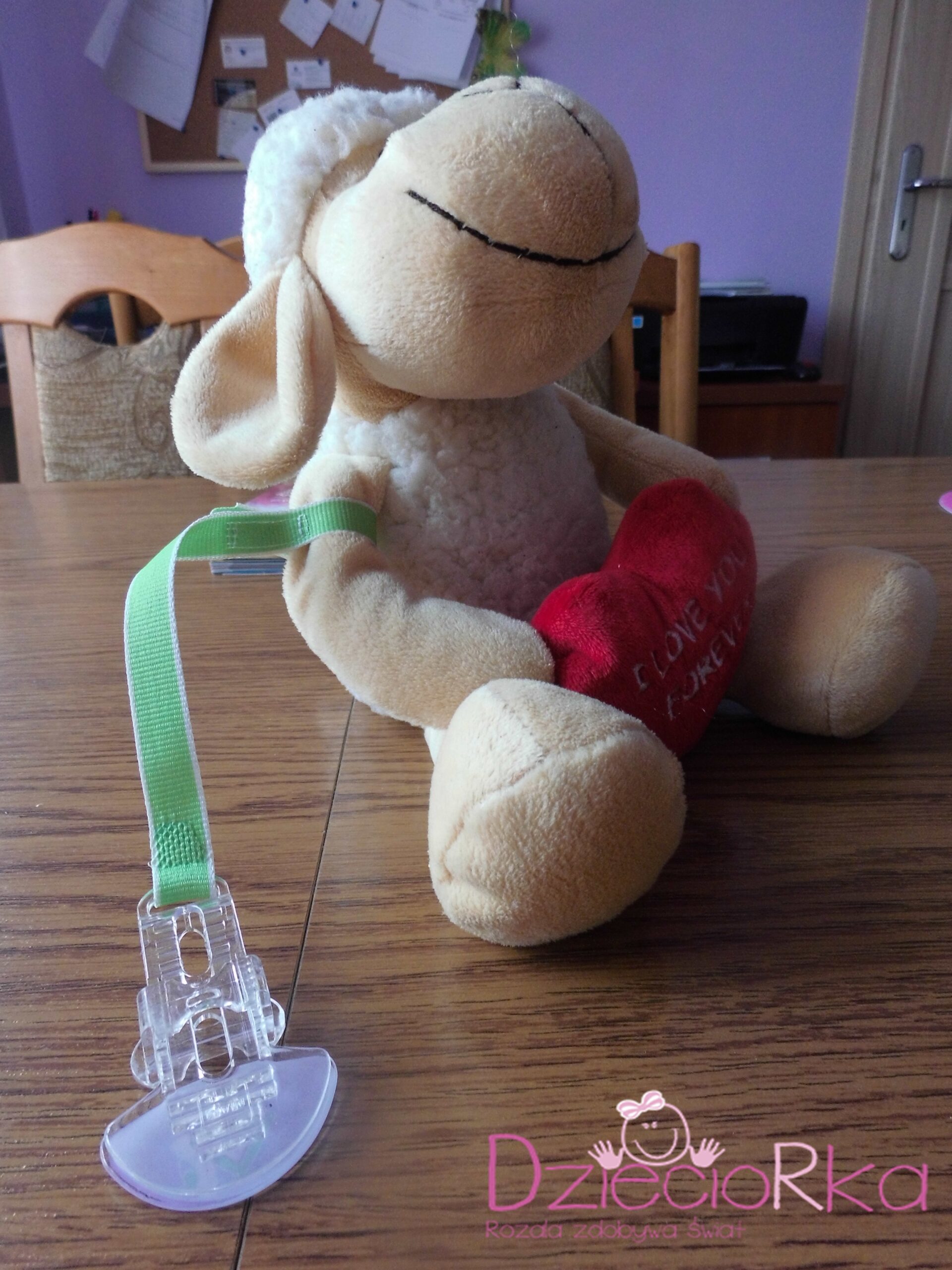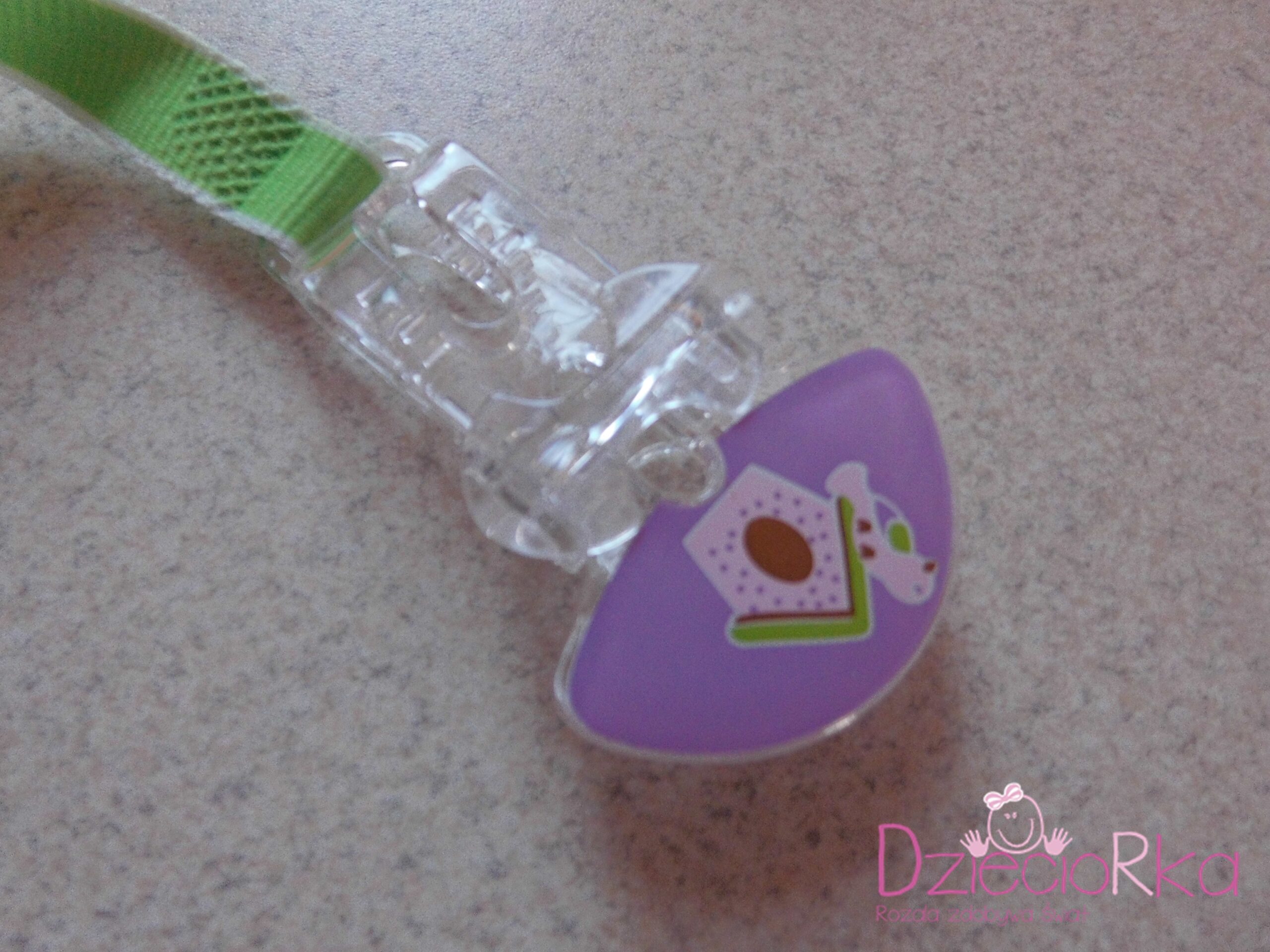 Co do samego klipsa, to wykonany jest z twardego plastiku. Młodzież uwielbia go gryźć i nie zostają po tym żadne ślady. Tasiemka jest bardzo wytrzymała, kubek z wodą utrzyma. Jedynie sam klips łatwo rozpracować. Dzieciorka poradziła sobie z jego odpięciem w 10 sekund. Nie udało jej się go zerwać, ale udało się odpiąć. Natomiast niemowlak nie da rady. Dla niemowlaka ten klips jest w pełni bezpieczny, nie ma ostrych, ani wystających elementów. Klips jest bardzo prosty, więc nie musimy się martwić, że coś odpadnie i zostanie połknięte. Klips pasuje do smoczków z uchwytem i do smoczków MAM. Co ważne można go myć.